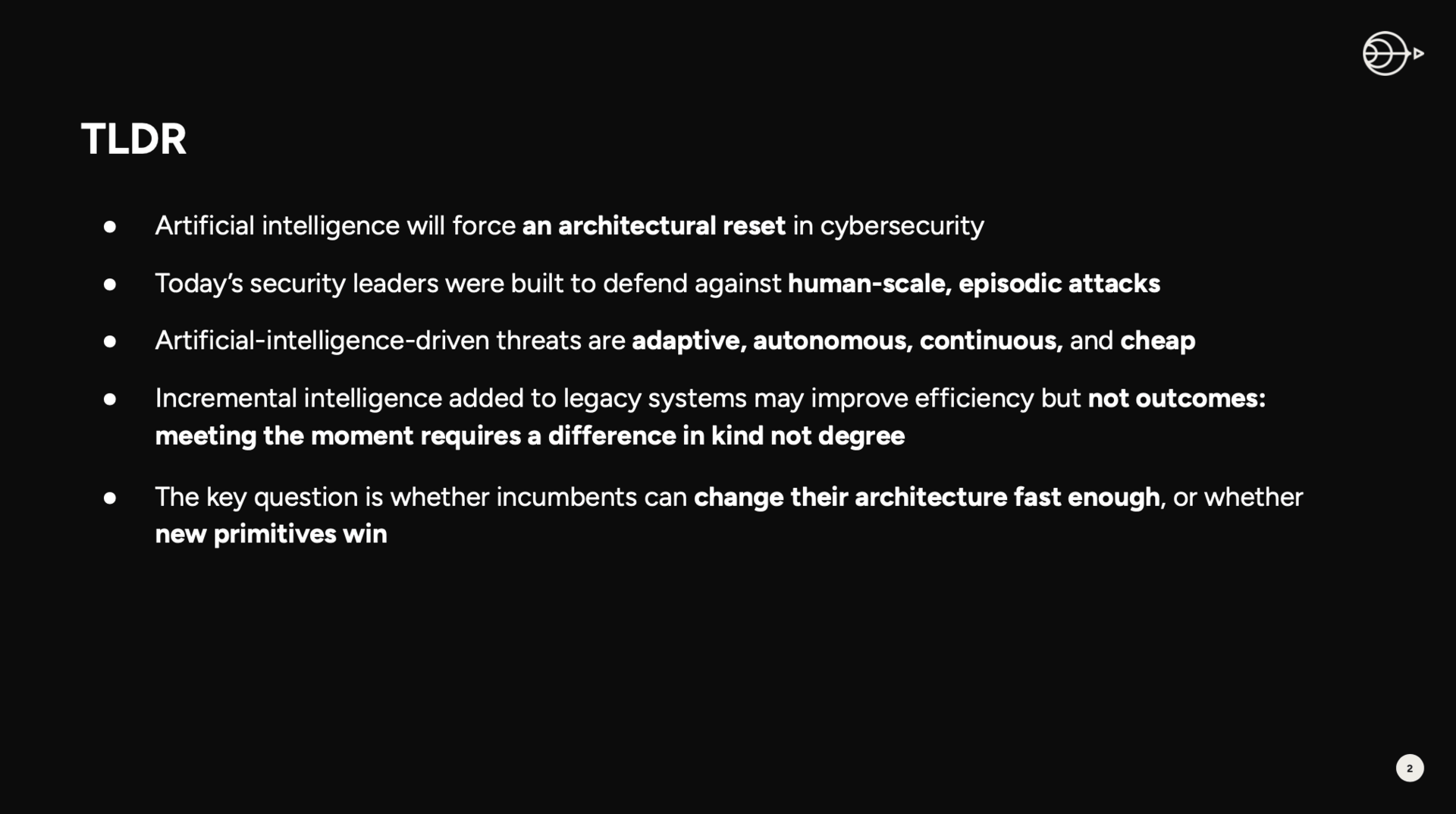 So far, it seems like we're treating this like an acceleration problem. Smarter models on existing stacks, faster correlation, automated responses. Run on the same primitives, the same assumptions but do it at machine speed. I can't imagine that's the answer.
