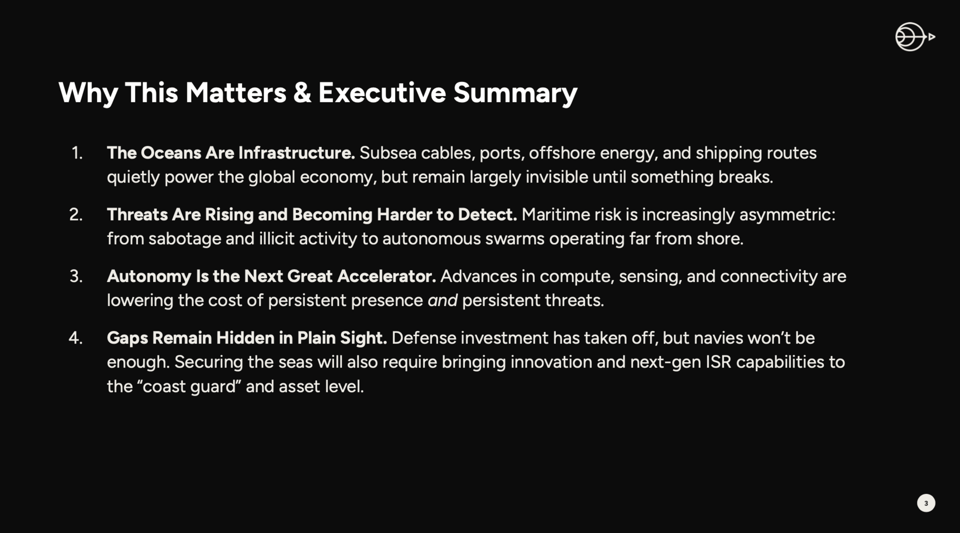 The ocean is the critical infrastructure that is always forgotten about until it breaks. And the advances in autonomy are going to mean we see exponentially more threats in exponentially more places. Innovation for defense needs to expand beyond building for naviess