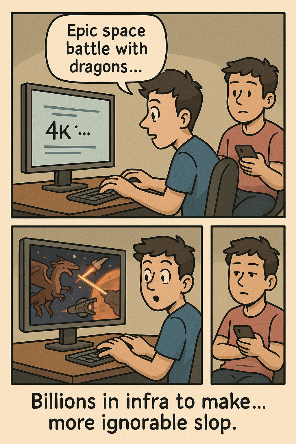 Here’s the real problem: the content just isn’t compelling. It’s got Studio Ghibli syndrome—everyone wants to try it, but nobody really wants to stick around. I’m not convinced that taking text and blowing it up into video (even when the quality gets great) is actually that interesting. It feels like a recipe for infinite, ignorable slop. Wild to see all this focus on high production value video, when in reality, standup comedy and memes (low production, high meaning) are what dominate culture today.