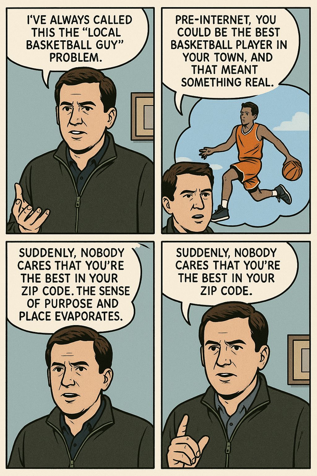 I’ve always called this the “local basketball guy” problem. Pre-internet, you could be the best basketball player in your town, and that meant something real. You had status, identity, a place. Now, you open Instagram, see some 14-year-old windmilling from the free-throw line, and realize you’re not even close. Suddenly, nobody cares that you’re the best in your zip code. The sense of purpose and place evaporates.