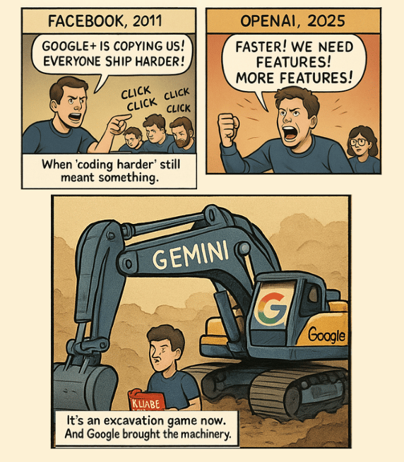 I can’t help but get déjà vu watching OpenAI’s “code red” response to Google Gemini. Fourteen years ago, I was in the only Facebook engineering building when Google+ launched. It truly felt like a sneak attack from a massive, well-resourced competitor. Google+ was polished, fast, and—at least on the surface—scary. Facebook’s response was a full-on lockdown: Mark rallied the troops, people pulled all-nighters, and there was this intoxicating sense of urgency, like we were at war. It was a blast. But here’s the thing: despite all the noise, Google+ turned out to be a nothing burger. Google copied the features but missed the magic of making social actually work. The only lasting impact? “Login with Google” gave them a real wedge, but otherwise, Facebook won.